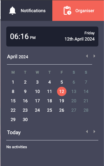 The Organizer is a versatile web application tool designed to help you stay organized and manage your daily activities efficiently. Located in the right sidebar, it provides you with an at-a-glance view of the current time and date, a dynamic calendar, and a list of upcoming activities you've subscribed to.